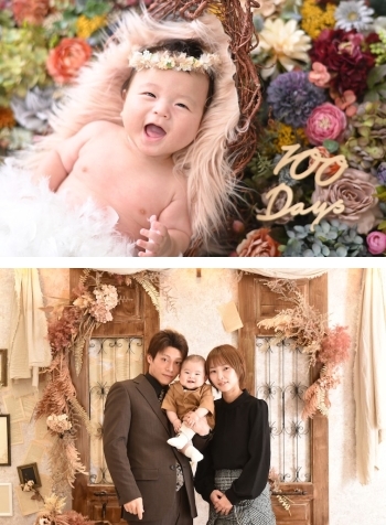 同社の百日(写真上)、一歳(写真下)の記念撮影の例。