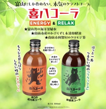 冒頭にかぶら寿しの発酵液の再利用について触れ、調味液「酵房のしずく」については紹介した。その開発にあたっては、ドリンクをはじめとする栄養機能食品も模索されていたのだが、同社の若手社員が開発の意欲を持ち続け、令和5年4月、商品として市場に送り出すまでに。それが北陸で最初のクラフトコーラとなった「喜八コーラ」だ。このコーラはかぶら寿しの発酵液の他に、富山湾の海洋深層水、利賀村のクロモジ茶などの地元産の原料を用い、ほっと一息つきたい時用の「RELAX」(リラックス)と、もうひと頑張りしたい時用の「ENERGY](エナジー)のふた品で上市された。